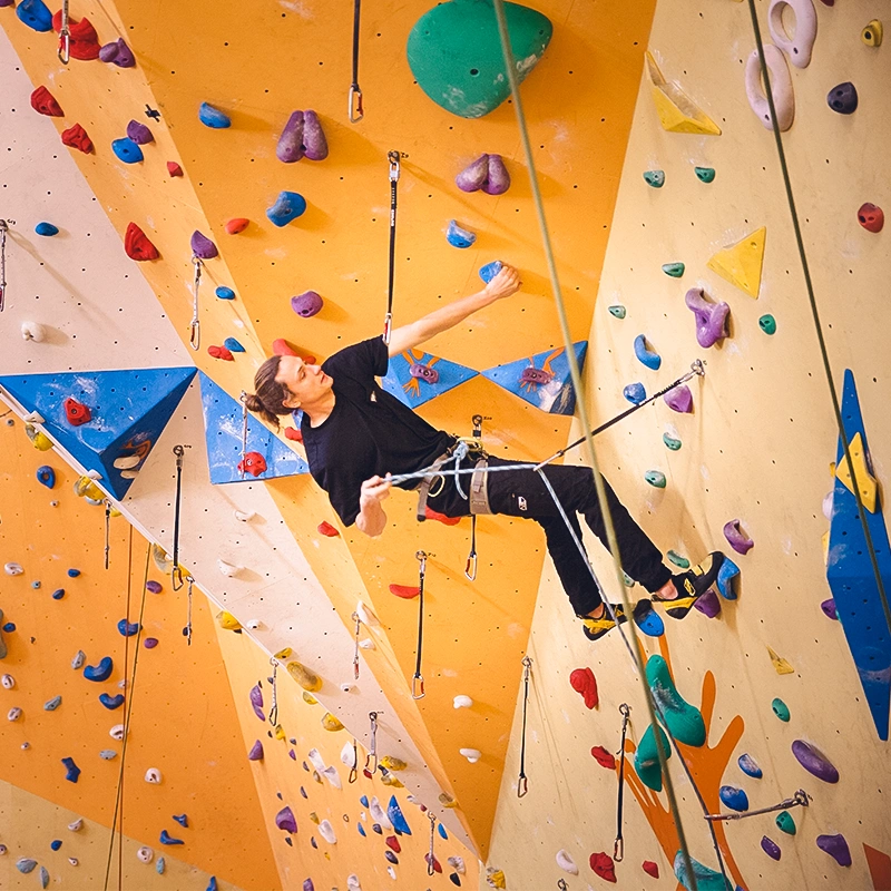 Scale vibrant routes and test your grip high above the mats.