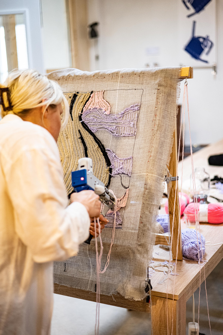 Always wanted to learn tufting? In this 5‑hour workshop you’ll learn everything you need to start making your own rugs. The instructor walks you through the different tufting guns (cut pile, loop pile, long pile), how to choose fabric and wool, transferring your design to the canvas, tufting techniques, and finishing (shaving, sculpting, gluing, backing). You can bring your own design or pick from the studio templates, and you’ll leave with a custom 40×50 cm rug you made yourself. The workshop includes lunch, unlimited drinks and snacks, and has a small group size (max 7 participants).
